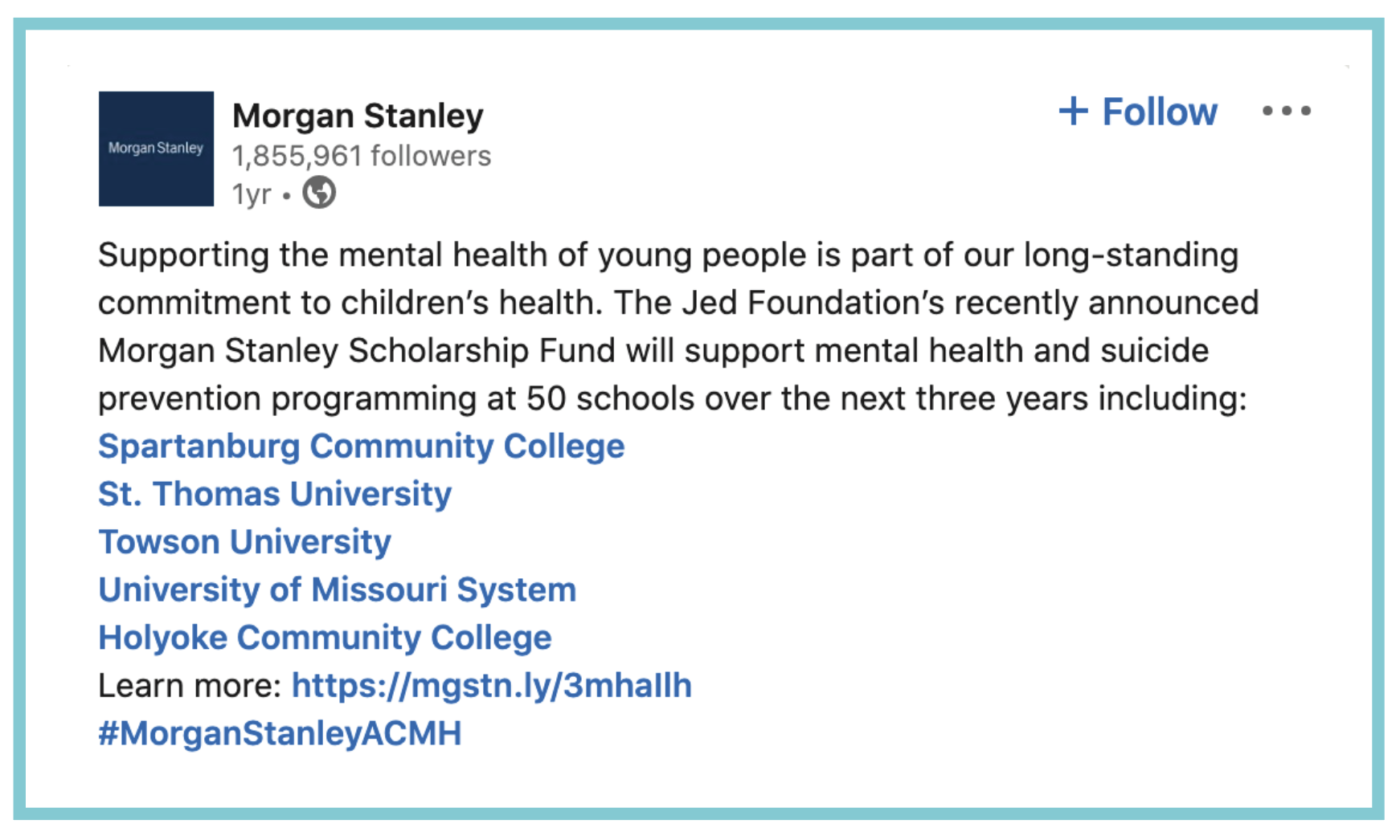 Morgan Stanley selected JED as a founding member for its Morgan Stanley Alliance for Children’s Mental Health. With support from the Morgan Stanley Foundation, the Alliance has significantly bolstered JED in expanding its reach among colleges, high schools, and communities, and deepened the impact of JED Campus.