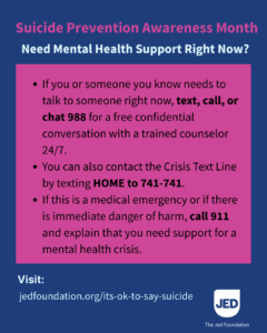 If you or someone you know needs to talk to someone right now, text, call, or chat 988 for a free confidential conversation with a trained counselor 24/7.